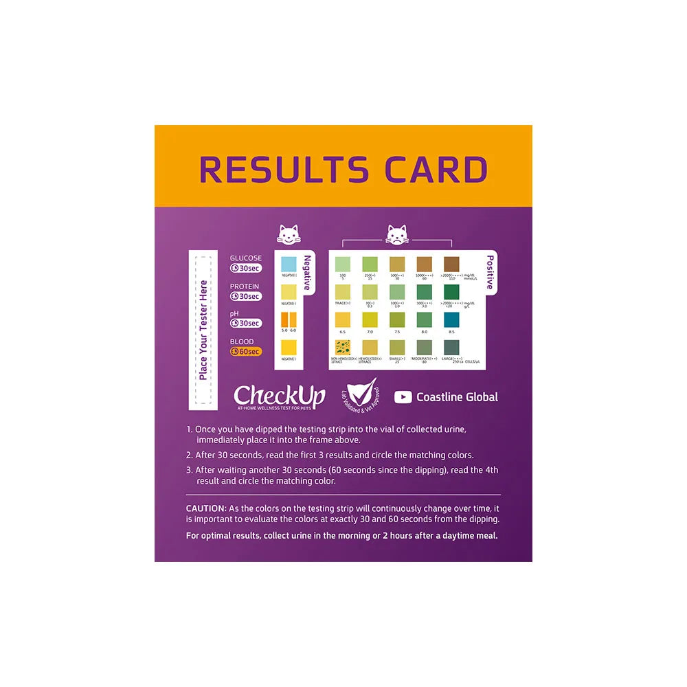 CheckUp هو طقم تحليل بول منزلي يكشف عن الأمراض الشائعة. باستخدام CheckUp، يمكنك اكتشاف أي حالة صحية في الوقت المناسب لمنع تدهور صحة قطتك وتحسين عمرها. كما يمكنك مراقبة صحتها حسب توجيهات الطبيب البيطري. يتضمن: 900 غرام من رمل القطط المقاوم للماء، ماصة واحدة للاستخدام مرة واحدة، قارورة واحدة لجمع الفضلات، وعبوتين من 4 شرائط معايرة.