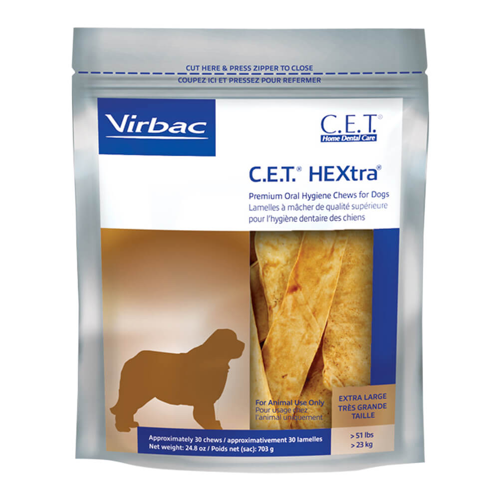 أثبتت التجارب السريرية أن علكات CET HEXtra Premium Chews للكلاب تقلل من تراكم الجير عند استخدامها يوميًا. تتميز بتأثير مطهر معروف، وتساعد على إزالة البلاك وتقليل الجير. العلكات مغلفة بمحلول غلوكونات الكلورهيكسيدين الحصري الحاصل على براءة اختراع بنسبة 10%. تحتوي على جلد البقر لتأثير تنظيف كاشط طبيعي. تساعد في الحفاظ على نظافة الأسنان وانتعاش النفس، حتى في الأيام التي لا يكون فيها تنظيف الأسنان بالفرشاة ممكنًا. تأثير مستمر. يتم إطلاق الكلورهيكسيدين في تجويف الفم أثناء المضغ، وقد يستمر لمدة تصل إلى 24 ساعة، مما يوفر تأثيرًا مضادًا للميكروبات بشكل مستمر. لا يمكن شحن هذا المنتج إلى نيو مكسيكو. - تحذيرات/تحذيرات: كما هو الحال مع أي منتج للحيوانات الأليفة غير مخصص للاستهلاك البشري، يُرجى إبعاده عن متناول الأطفال وغسل اليدين بعد التعامل معه. لا يمكن تحقيق فائدة نظافة الفم من علكات CET HEXtra Chews إلا من خلال المضغ الكافي. سيؤدي ابتلاع العلكات كاملة إلى تقليل فعاليتها وإضرارها بحيوانك الأليف. طريقة الاستخدام: أعطِ كلبك مضغة واحدة على الأقل يوميًا أو حسب توجيهات الطبيب البيطري للمساعدة في تقليل البلاك والجير. هذا المنتج مخصص للتغذية المتقطعة أو التكميلية فقط. المكونات: جلد بقري خام، مالتوديكسترين، كبد دواجن مُحلل، غلوكونات الكلورهيكسيدين، غلوكونات الصوديوم، مزيج من التوكوفيرول، غلوكونو-دلتا-لاكتون، سوربيه البوتاسيوم.