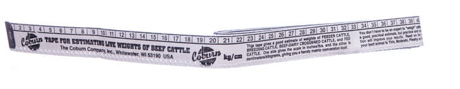 Cinta métrica para ganado bovino de Coburn. Estima con precisión el peso de bovinos de engorde y reproductores. Peso mínimo: 43,5 kg (96 lb), peso máximo: 735 kg (1618 lb). Utilice la cinta para comparar el peso con promedios, calcular promedios de alimentación, dosis de medicamentos, determinar fechas de venta, reproducción, etc. Fabricada en Tyvek antidesgarro. 274 cm (108") de largo, doble y cosida con extremos de aluminio. Coloque la cinta alrededor del animal a la altura del pecho, justo detrás de las patas delanteras. Ajuste la cinta sin apretarla demasiado. Lea la estimación del peso en la báscula. Instrucciones completas impresas en la cinta. Descargo de responsabilidad: Se ha hecho todo lo posible para garantizar la precisión de la información publicada. Sin embargo, es responsabilidad del lector familiarizarse con la información del producto que figura en la etiqueta o el prospecto. - ALTURA (PULGADAS): 25,4 cm (1") - ANCHO (PULGADAS): 50,8 cm (2") - LARGO (PULGADAS): 11,4 cm (4,5")