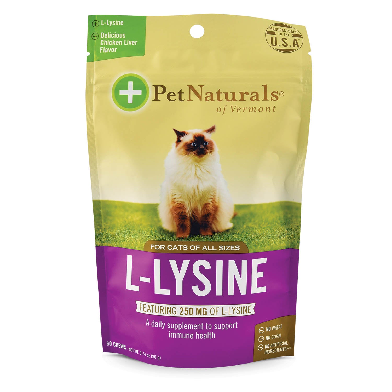 Golosinas masticables de L-lisina para gatos. 60 divertidas golosinas con forma de pez y sabor a hígado de pollo que favorecen la salud de los tejidos, el sistema respiratorio y la vista. Administre de 1 a 2 golosinas al día. Sin maíz, trigo, colorantes ni tintes artificiales. Consulte la información del fabricante o la etiqueta. Dimensiones: Alto: 3,5 pulgadas; Ancho: 1,5 pulgadas; Largo: 4,5 pulgadas.