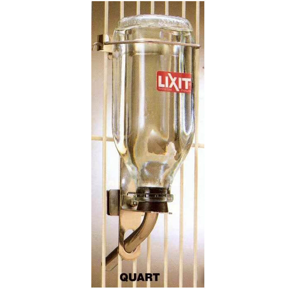 Bebedero de vidrio Lixit. El bebedero de vidrio Lixit tiene tubos de diferentes tamaños: pequeño (5/15"), mediano (3/8") y grande (5/8"). Está diseñado para aves grandes y pequeñas, así como para otros animales como conejos, hurones, cobayas, chinchillas y perros pequeños. El kit incluye un soporte de montaje de acero y se fija fácilmente a jaulas de alambre con los accesorios necesarios para un llenado y limpieza rápidos. Mantiene el agua fresca y limpia. Fabricado con un tubo de acero inoxidable y un tapón de goma no tóxico aprobado por el USDA. - PRECAUCIONES/ADVERTENCIAS: Asegúrese siempre de que el bebedero funcione correctamente antes de dejar a su mascota sola. Revise el agua y el tubo diariamente. - INSTRUCCIONES: Instalación sencilla: El exclusivo soporte de cierre rápido está diseñado para una aplicación universal y se puede instalar en la mayoría de las jaulas de alambre, metal o madera. No se requieren herramientas para el montaje. Simplemente elija una ubicación conveniente y coloque el soporte de manera que el tubo quede a la altura de la cabeza de su ave o mascota. Si es necesario, corte o separe los alambres de la jaula para la abertura del tubo. Instale con tornillos y arandelas de montaje. Asegúrese de que las muescas del soporte de bloqueo estén orientadas hacia abajo, como se muestra en la ilustración. Las arandelas de montaje se pueden colocar en alambre horizontal, vertical o diagonal (como en una cerca de malla metálica). Apriete bien los tornillos.