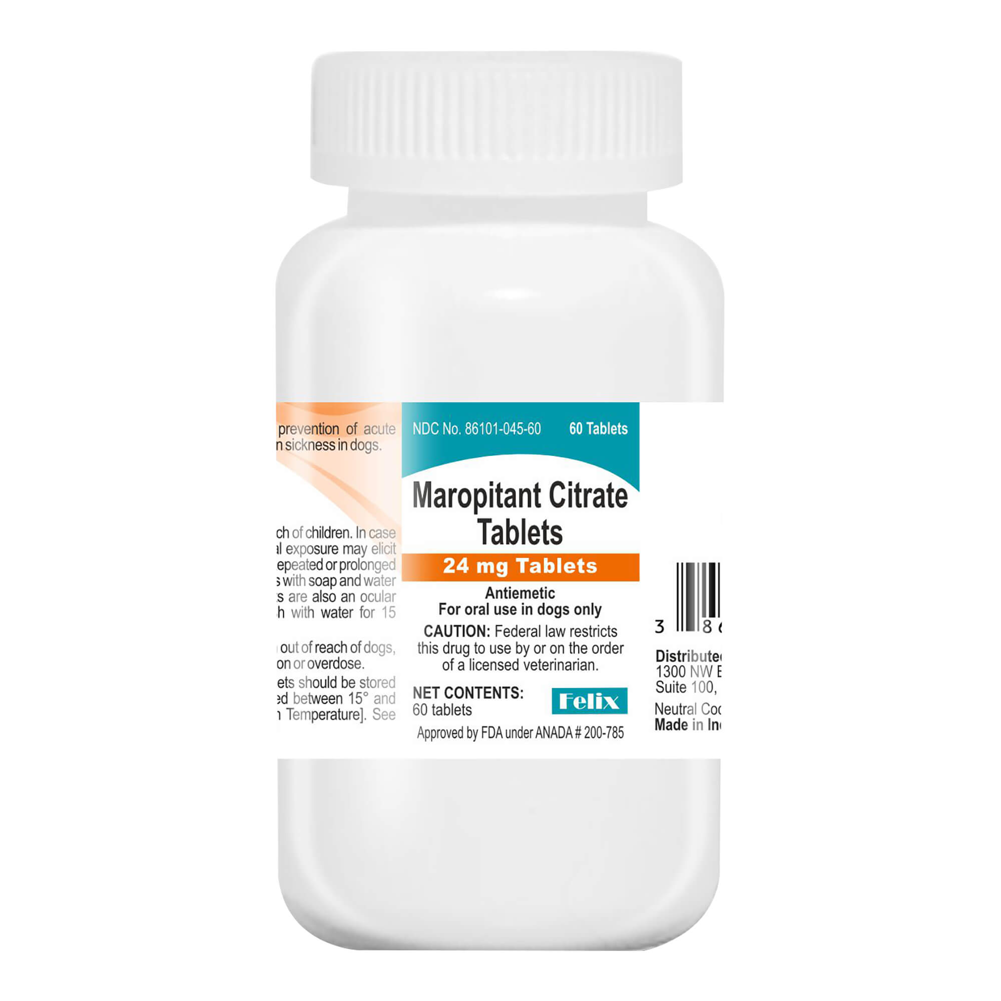 Maropitant Citrate Tablets are indicated for the prevention of acute vomiting and the prevention of vomiting due to motion sickness in dogs. - CAUTIONS/WARNINGS:Not for use in humans. Keep out of the reach of children. In case of accidental ingestion, seek medical advice. Topical exposure may elicit localized allergic skin reactions in some individuals. Repeated or prolonged exposure may lead to skin sensitization. Wash hands with soap and water after administering drug. Maropitant Citrate Tablets are also an ocular irritant. In case of accidental eye exposure, flush with water for 15 minutes and seek medical attention. In puppies younger than 11 weeks of age, histological evidence of bone marrow hypocellularity was observed at higher frequency and greater severity in puppies treated with maropitant citrate compared to control puppies. In puppies 16 weeks and older, bone marrow hypocellularity was not observed. Keep Maropitant Citrate Tablets in a secure location out of reach of dogs, cats, and other animals to prevent accidental ingestion or overdose. - DIRECTIONS:For Prevention of Acute Vomiting in dogs 2 -7 months of age: Administer Maropitant Citrate Tablets orally at a minimum dose of 2 mg/kg (0.9 mg/lb) body weight once daily for up to 5 consecutive days. For Prevention of Acute Vomiting in dogs 7 months of age and older: Administer Maropitant Citrate Tablets orally at a minimum dose of 2 mg/kg (0.9 mg/lb) body weight once daily until resolution of acute vomiting. - INGREDIENTS:Maropitant - HEIGHT(INCHES): 3.238 - WIDTH(INCHES):0.980 - LENGTH(INCHES):1.740