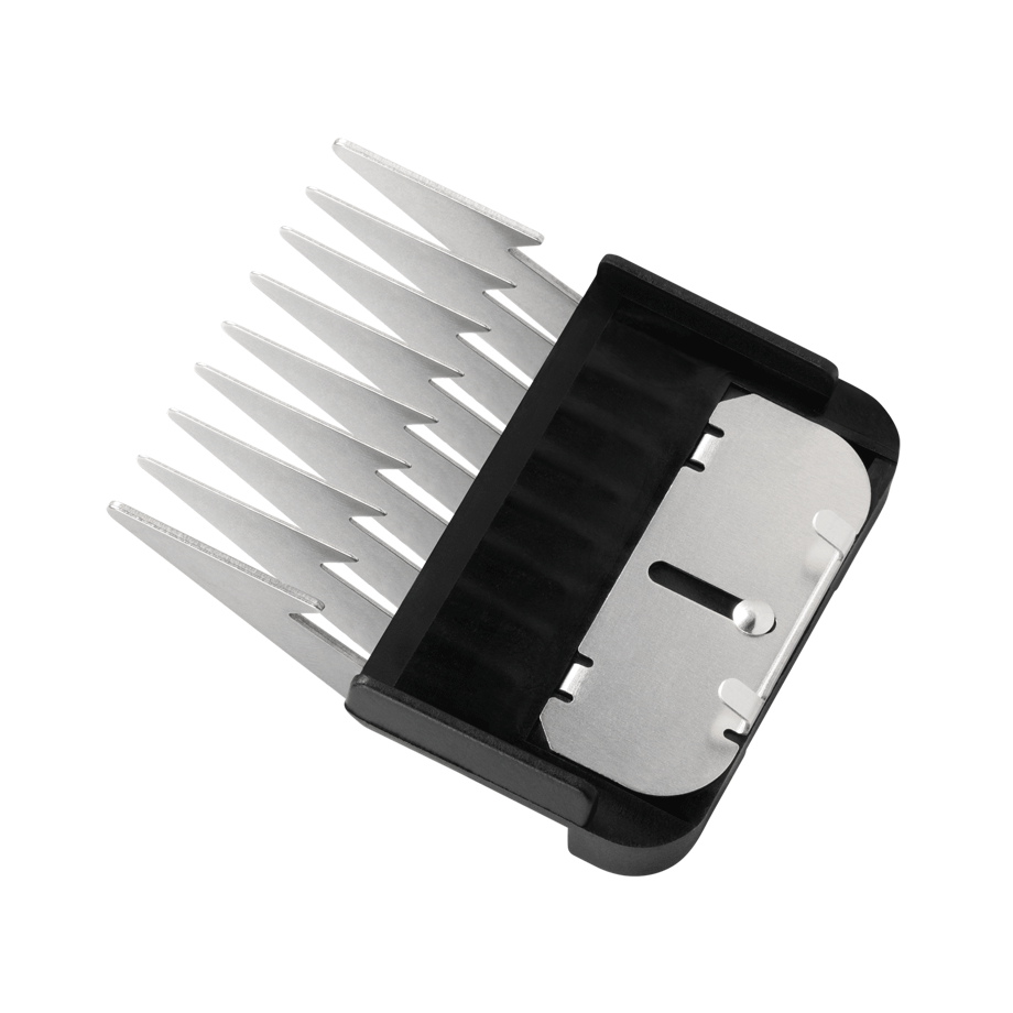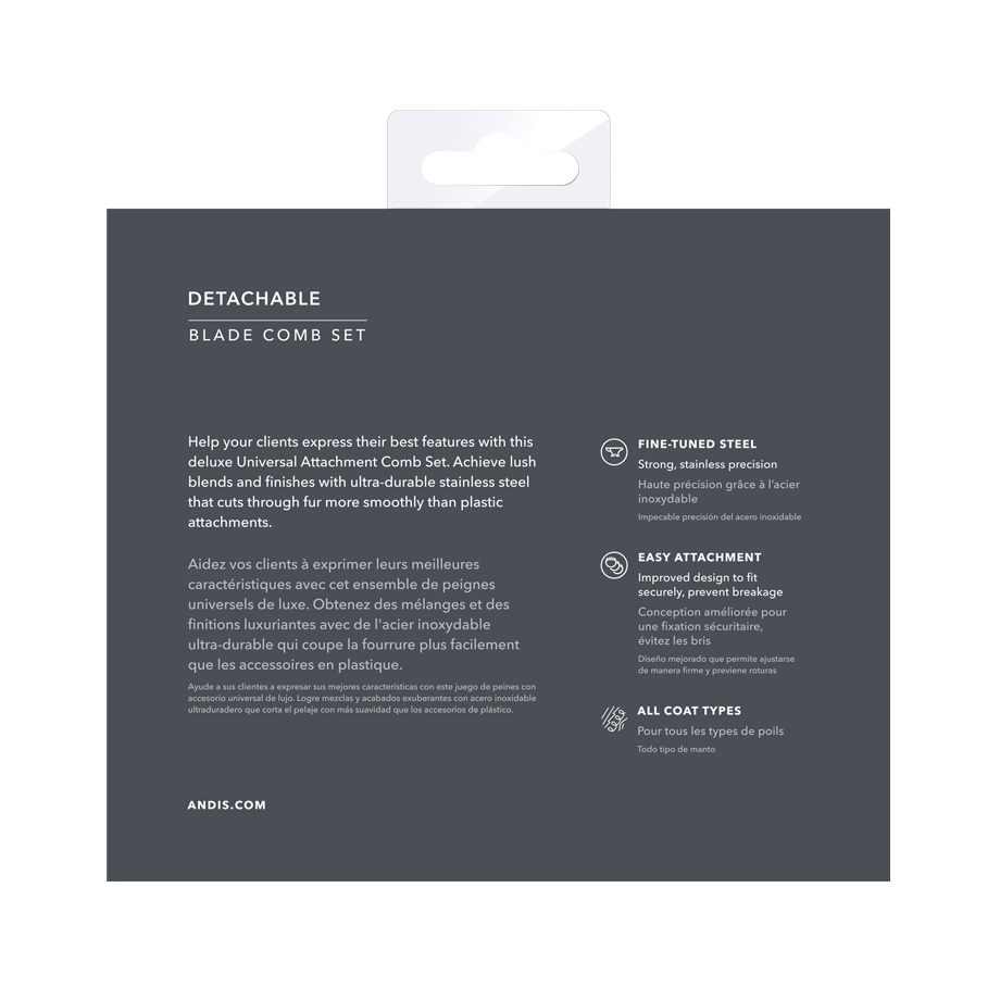 Bright, vibrant comb colors help you stay organized and find your match quickly while conquering whatever comes through the salon door. The Universal Stainless-Steel Attachment Combs: demonstrate flair for every cut.