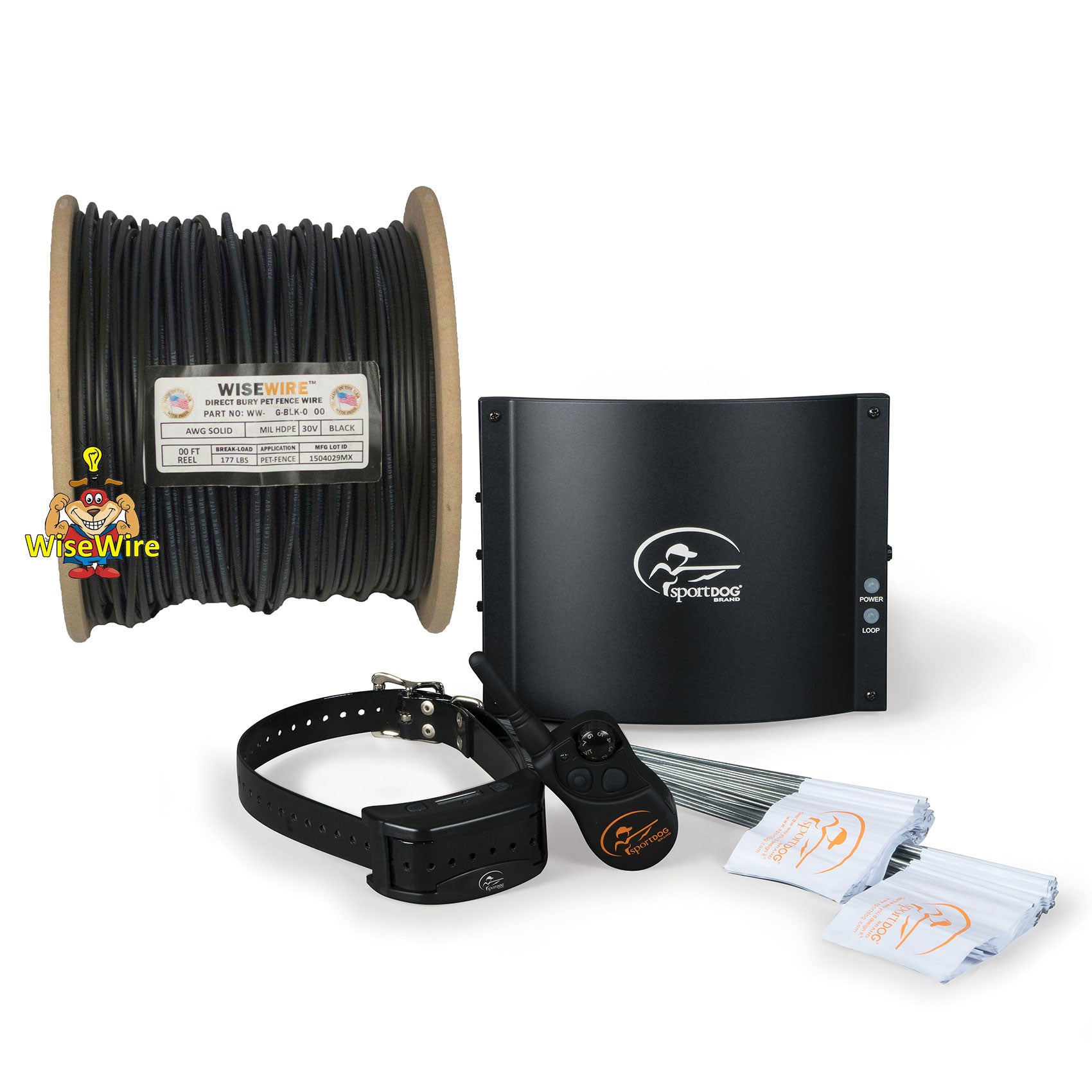 Package contents: Collar Receiver on Black 1 Inch Collar Strap, Containment Transmitter, Remote Transmitter, 1,000 Feet of 16-Gauge WiseWire®, 100 Boundary Flags, Charging Adapters, Standard Contain Points, Long Contact Points, Lanyard, Test Light Tool, and Basic Training Manual and DVD.