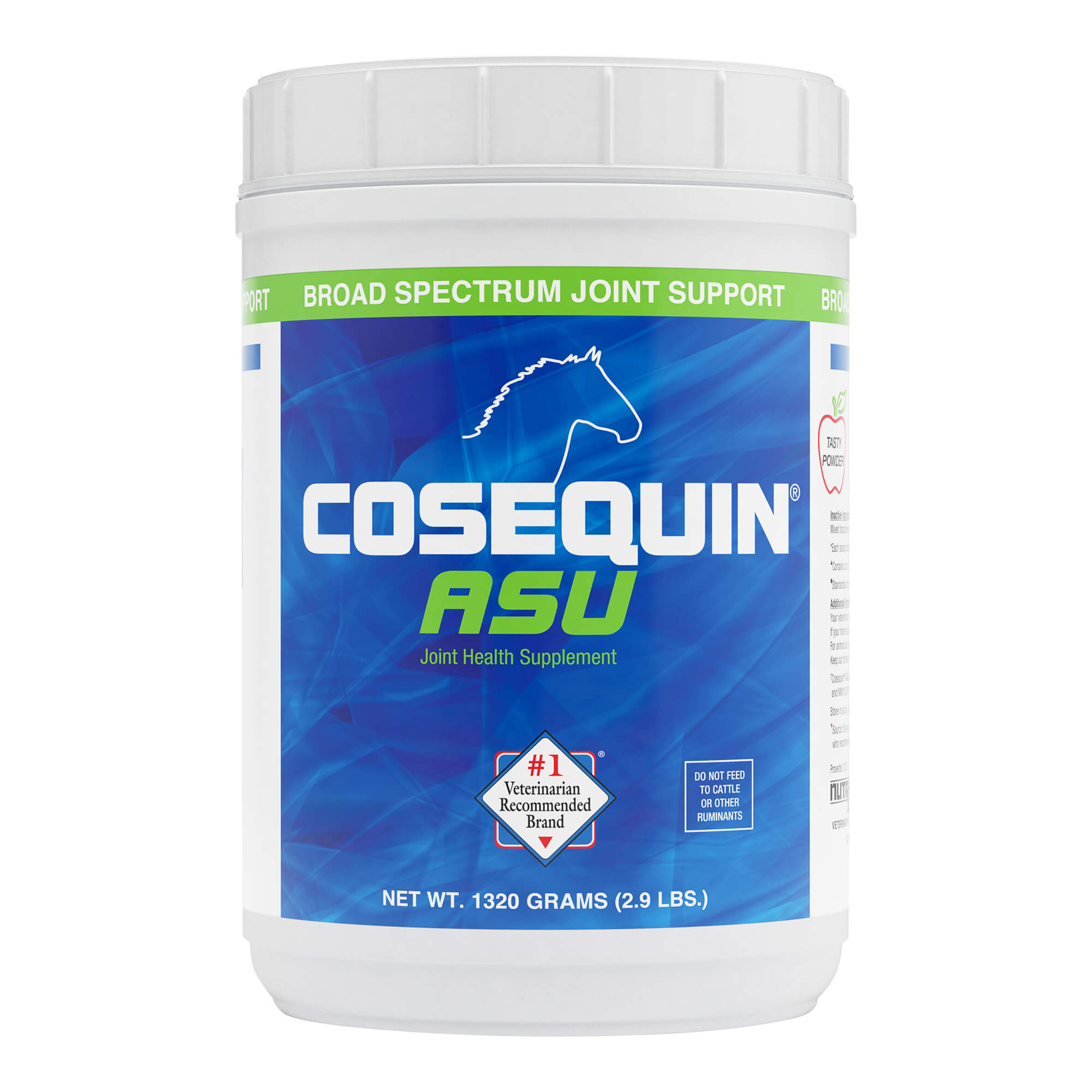 - CAUTIONS/WARNINGS:See product for details. - DIRECTIONS:Initial 2-4 weeks, under 600 lbs 1 scoop, 600-1200lbs 2 scoops daily, over 1200lbs 3 scoops daily. - INGREDIENTS:32.4 grams contains:* Glucosamine Hydrochloride 14,400mg, Methylsulfonylmethane (MSM) 10,000mg, Chondroitin Sulfate 2,400mg, Avocado/Soybean Unsaponifiables (ASU) Powder 2,100mg, Boswellia Serrata Extract 560 mg, Manganese 100 mg. *Each scoop contains approximately 16.2 grams. Contains up to 10% moisture. Standardized to contain a minimum of 30% avocado/soybean unsaponifiables. Additional Information: Your veterinarian is your best ally in managing your horse’s health. If your horse has any condition that requires medical attention, you should always consult your veterinarian. For animal use only. This product should not be given to animals intended for human consumption. Keep out of reach of children. Cosequin ASU contains FCHG49 Glucosamine, TRH122 Sodium Chondroitin Sulfate, and NMX1000 Avocado/Soybean Unsaponifiables.Inactive Ingredients: Mixed tocopherols, natural and artificial apple flavor, silicon dioxide, and soy protein isolate. - MATERIAL/COMP:Powder - HEIGHT(INCHES): 8.500 - WIDTH(INCHES):5.000 - LENGTH(INCHES):5.000