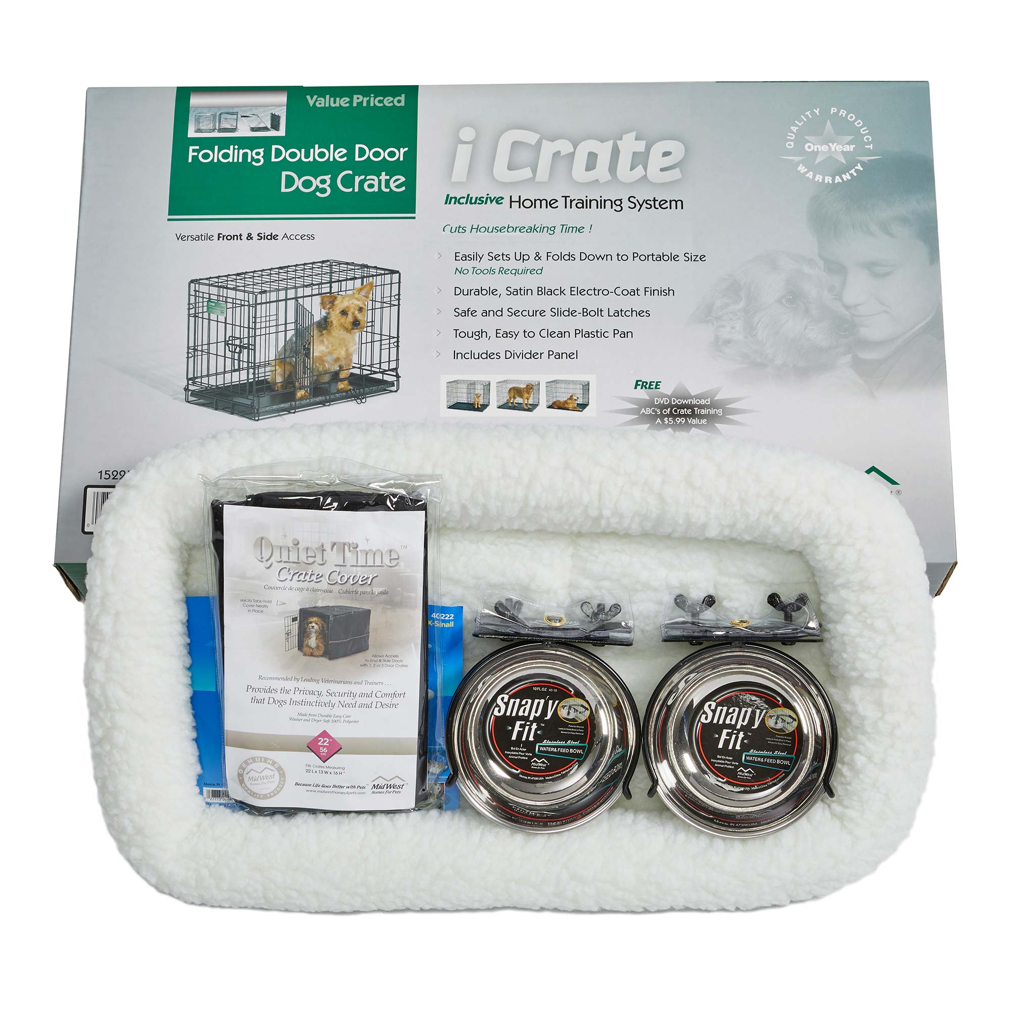Everything you need arrives in one box. The icrate was designed completely around the safety, security and comfort of your dog. Two doors for easy access to your pet inside either thru the traditional front door or from the side with the second door. The dog crate comes to you equipped with every feature you can think of: a composite plastic pan for easy cleanup in the event of an accident; plastic carrying handle to move the dog crate from one location to another comfortably; safe and secure slide bolt latches for the safety and security of the pet inside and the furniture on the outside; and most importantly a FREE divider panel for use while your puppy is still growing up. The easy-to-use crate cover simply slips over the top of your Midwest crate. The crate cover offers proper ventilation and can be used with 1, 2, or 3 door crates, allowing entrance and access from multiple sides. The crate cover also allows access to the slide-out plastic pan in your crate for easy removal and cleaning. The Snap'y Fit patented system holds the bowl firmly in place and yet, allows easy removal. Pet parents have been frustrated for years with conventional water bowls because pets can dislodge the bowls and spill the food and water. The Snap'y Fit patented system solves this problem.