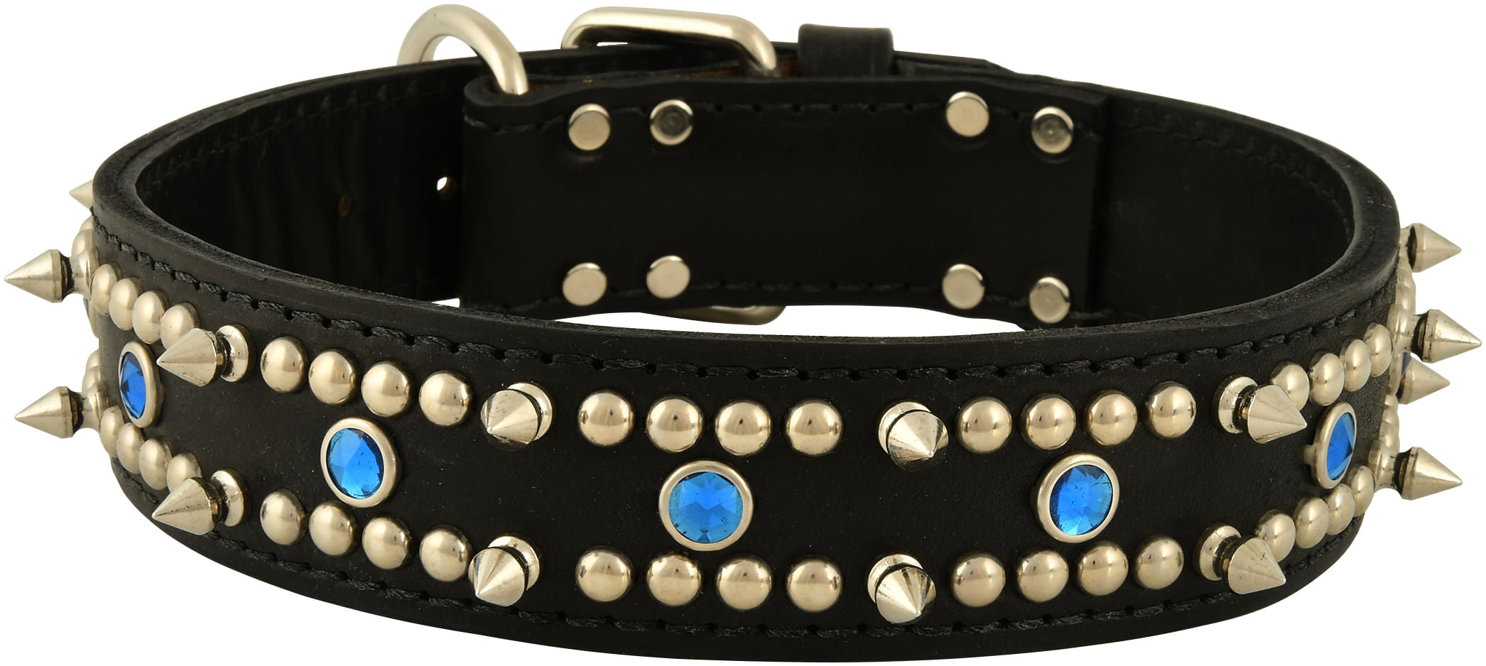 Latigo Protector Spiked, Studded & Jeweled Dog Collar These 2-ply latigo leather collars are made with heavy nickel hardware and stitched with premium nylon thread. Features of the Latigo Protector Collar: 1/2" solid steel nickel plated spikes set with brass rivets handsome studs and blue jewels dee-in front design is ideal for use with tie-outs Add 2" to the exact neck measurement for collar correct size. - HEIGHT(INCHES): 1.250 - WIDTH(INCHES):2.000 - LENGTH(INCHES):23.500