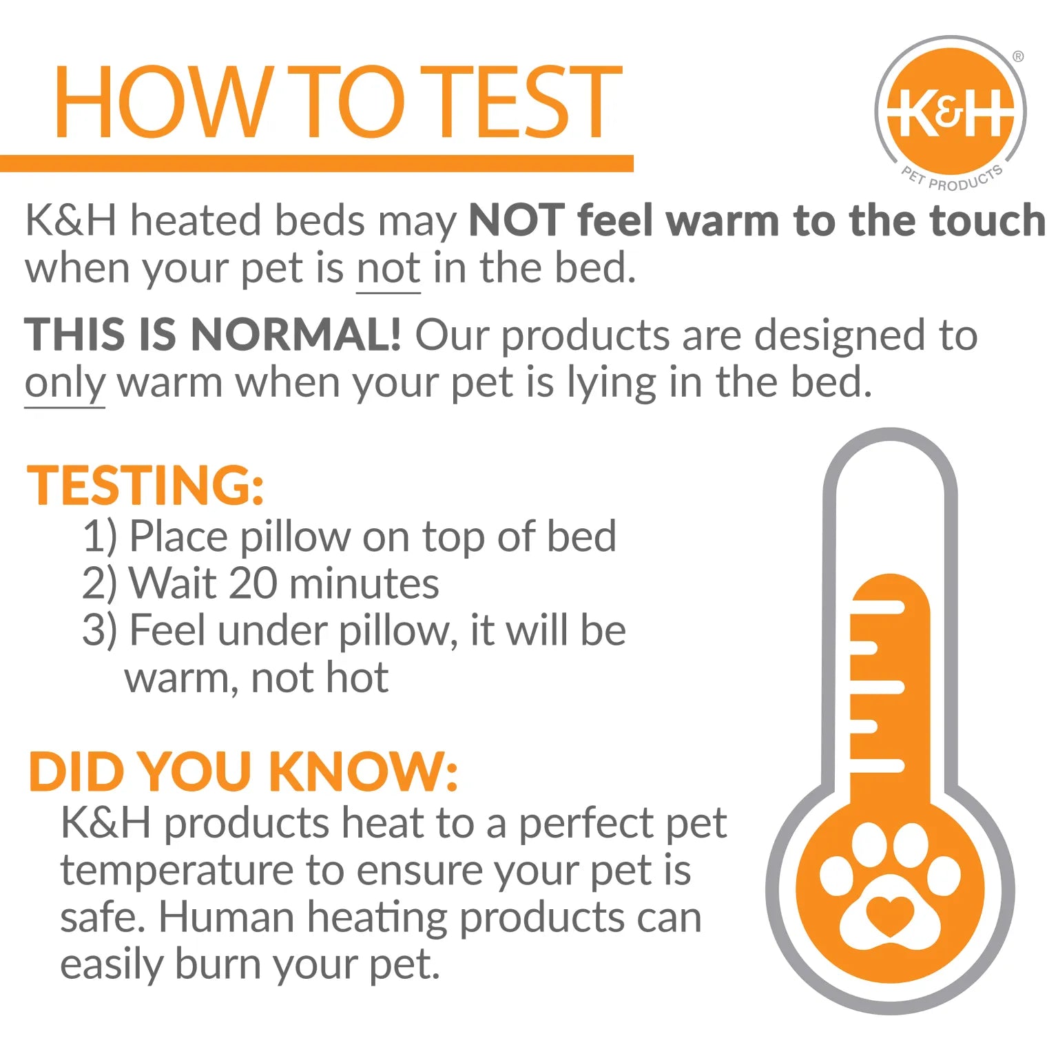 Extremely low wattage. This outdoor heated dog bed/outdoor heated cat bed is perfect for the doghouse, cat house, basement, garage, barn, shed, porch or any outdoor dog or cat shelter. This soft, orthopedic bed provides comfortable warmth even in sub-zero weather. It uses an internal thermostat to keep the temperature at a desirable 102 when the pet lies upon the heated pad; and will remain 10-15 degrees above ambient air temperature when your pet is not on the bed. Soft PVC protects from water and a free removable, washable cover is included for easy care. The K&H Lectro-Soft Outdoor Heated Dog and Cat Beds are recommended for Indoor or outdoor use. This heated dog mat/heated cat mat has been tested and certified by MET Labs to exceed USA/CA electrical safety standards. Note: This is a soft bed that is NOT recommended for destructive dogs. If you have a pet that chews or is destructive, we suggest the rugged. Remove the cover from the bed. Machine wash cover only, separately. Mild detergents, no bleach. Cold water, gentle cycle. Air or line dry. Dry completely before reassembly. Heated pad can be wiped with damp cloth, allow to dry completely before use.