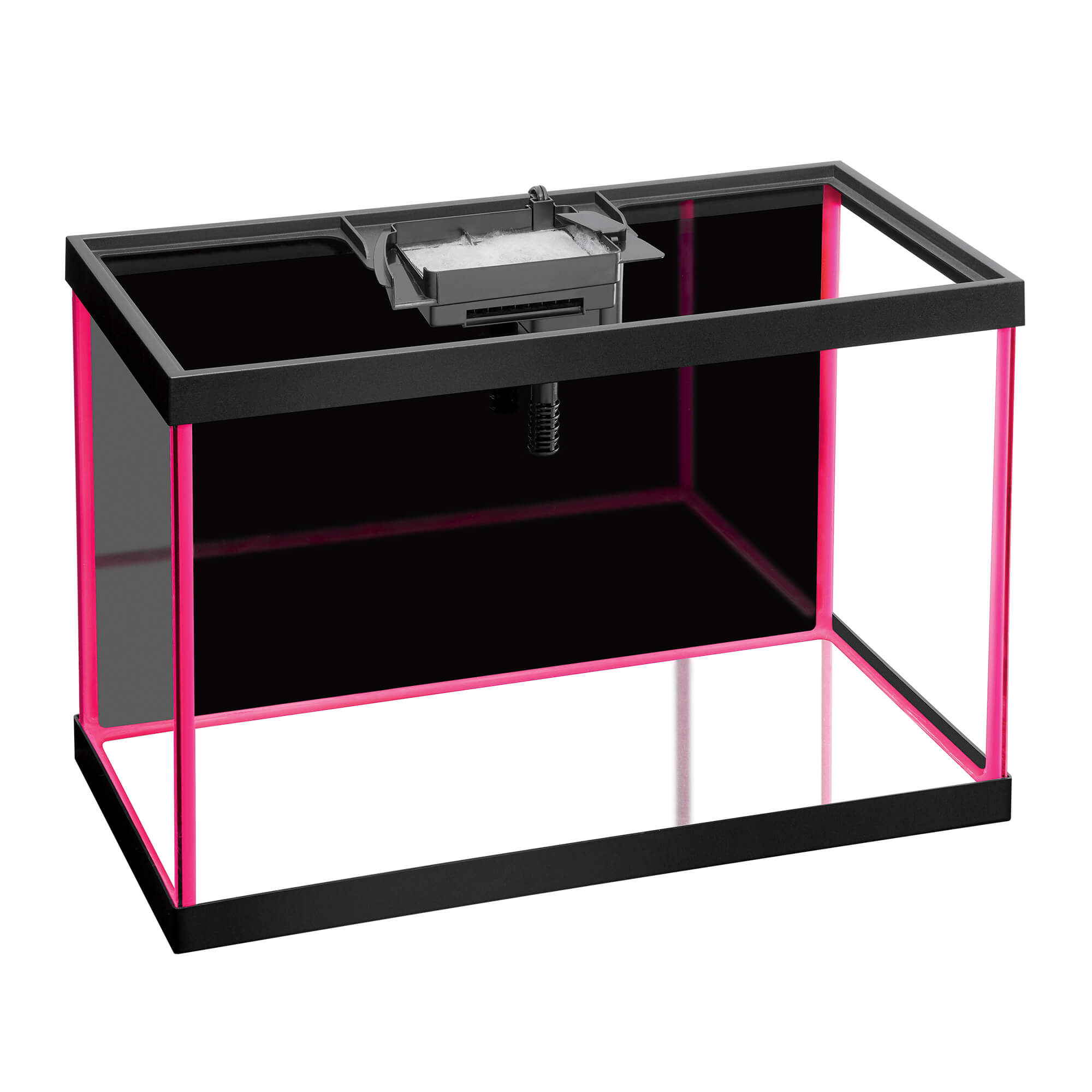 These kits feature a glass tank with colorful silicone that fluoresces under blue LED lighting. Also inside each kit is coordinating decorative plants and gravel. Kit includes: Glass Aquarium with Fluorescent Silicone, Low Profile Hood with Blue LED Lighting, QuietFlow Power Filtration, Multi-colored Gravel, Decorative Plants, Black Backing, Filter Cartridge, Premium Fish Food Sample, Water Conditioner Sample and Set-up Guide.
