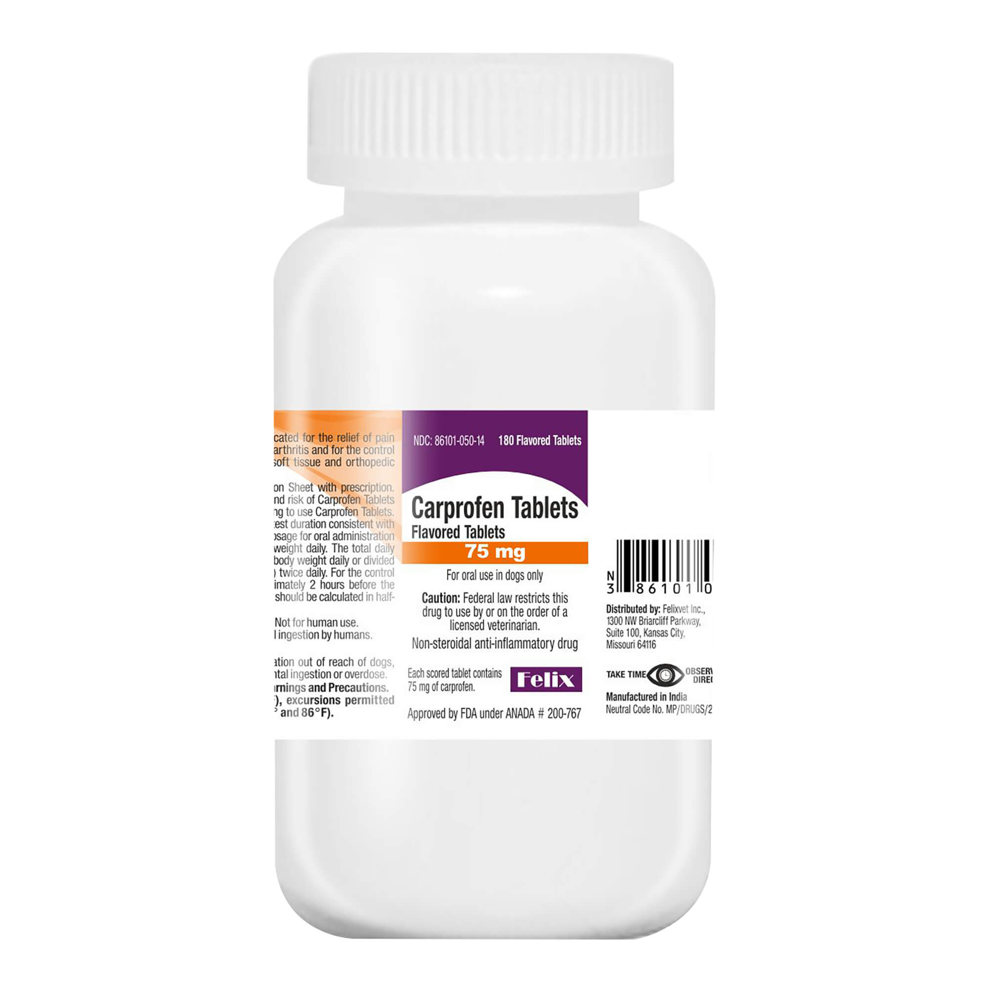 Carprofen Tablets are a nonsteroidal anti-inflammatory drug (NSAID) that is used to reduce pain and inflammation (soreness) due to osteoarthritis and pain following surgery in dogs. Carprofen Tablets are a prescription drug for dogs. They are available as tablets and are given to dogs by mouth. - CAUTIONS/WARNINGS:Keep out of reach of children. Not for human use. Consult a physician in cases of accidental ingestion by humans. For use in dogs only. Do not use in cats. As a class, cyclooxygenase inhibitory NSAIDs may be associated with gastrointestinal, renal and hepatic toxicity. - DIRECTIONS:Always provide Client Information Sheet with prescription. Carefully consider the potential benefits and risk of Carprofen Tablets and other treatment options before deciding to use Carprofen Tablets. Use the lowest effective dose for the shortest duration consistent with individual response. The recommended dosage for oral administration to dogs is 2 mg/lb (4.4 mg/kg) of body weight daily. The total daily dose may be administered as 2 mg/lb of body weight once daily or divided and administered as 1 mg/lb (2.2 mg/kg) twice daily. For the control of postoperative pain, administer approximately 2 hours before the procedure. Tablets are scored and dosage should be calculated in half-tablet increments. - INGREDIENTS:Carprofen - HEIGHT(INCHES): 4.630 - WIDTH(INCHES):0.980 - LENGTH(INCHES):2.195
