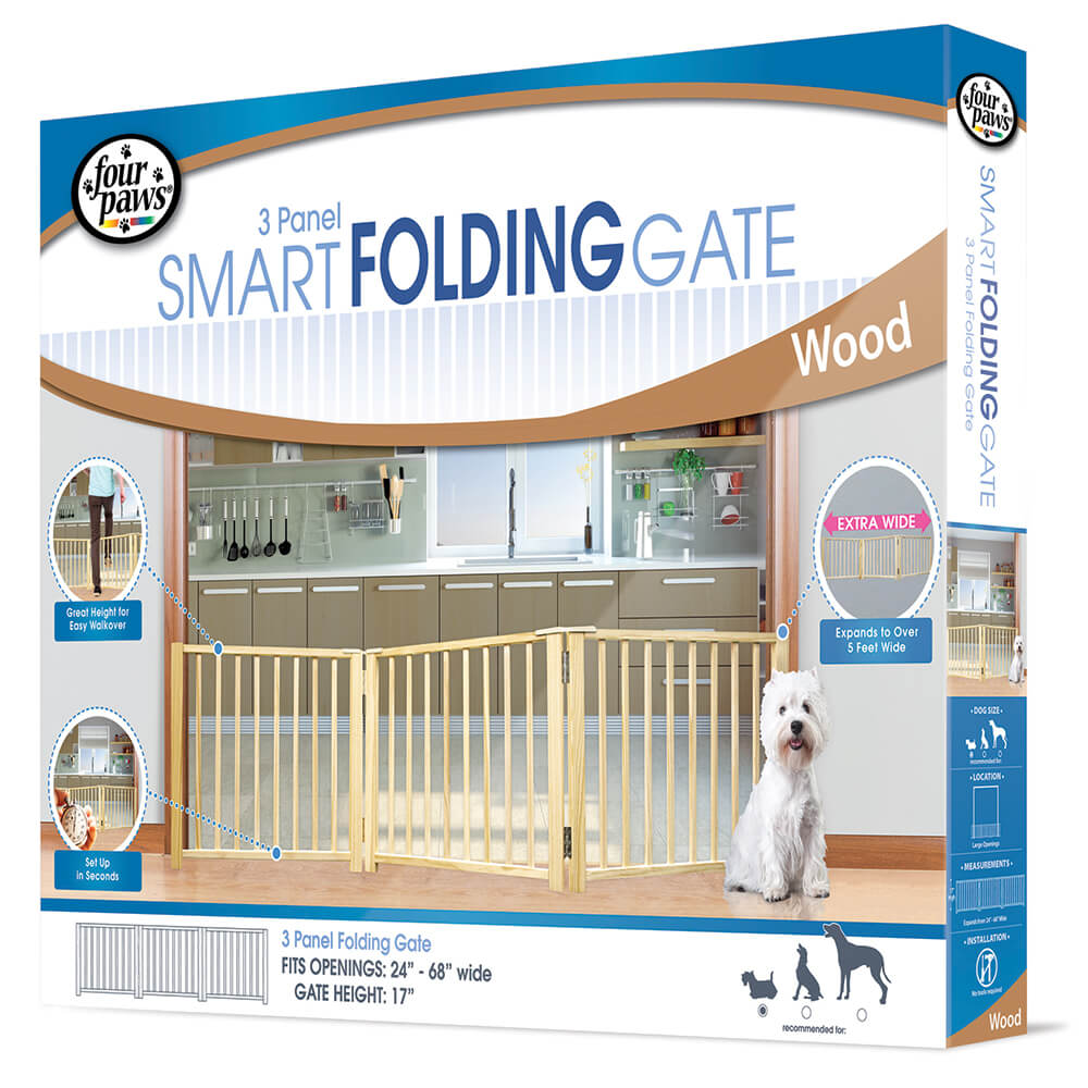 The Four Paws 3-Panel Folding Gate is designed to contain your small pet in one area, while allowing family members to easily move from room to room by simply stepping over the gate. Featuring a stylish natural wood design, this gate sets up in seconds and collapses for easy storage- no tools or assembly required! The versatile 3-Panel Folding Gate is freestanding and easily expands from 24" to 68" wide, so it can be moved from room to room and made to fit small to large openings.