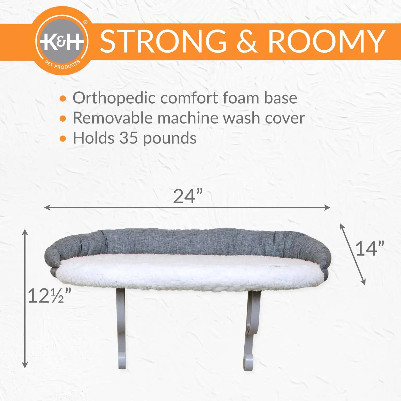The unique design provides cats superior comfort and style with its orthopedic foam insert and soft fleece cover. Easily mounts to any wall and include detailed instructions and hardware. The K&H Universal Wall Mount Bolster Cat Perch has an added bolster for comfort in addition to its orthopedic foam insert and fleece cover. The bolster can help protect walls! All covers of the K&H Pet Products wall mounted cat beds are removable and machine washable for easy wash and care; simply remove the cat perch cover and toss in the washer, then pop in the dryer or line dry. Designed by K&H with OVER 20 years of experience in creating safe, innovative, quality products for pets; one year limited warranty.