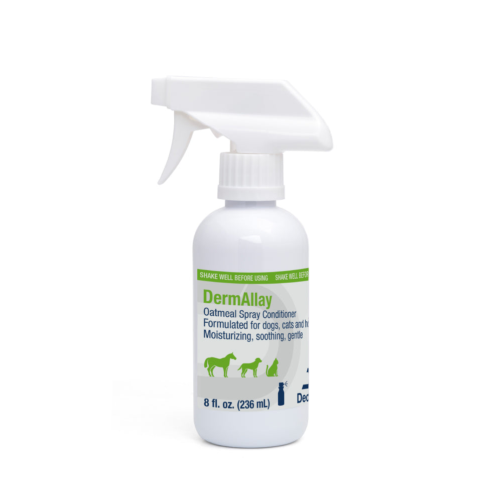 DermAllay Oatmeal Conditioner is used to support and promote relief of dry, itchy, sensitive skin. Ceramides aid in moisturizing, repairing, and restoring dry, damaged skin. - DIRECTIONS:Directions for Use: SHAKE WELL BEFORE EACH USE. If pet is dry, apply directly to skin and haircoat and allow to dry. If pet is wet, remove excess moisture, apply directly to skin and haircoat and allow to dry. - INGREDIENTS:Water, Glycerine, Silicone Emulsion, Stearamidoproply Dimethylamine Lactate, Polysorbate 20, Sodium Lactate, Fragrance, Hydrolyzed Oats, Safflower Oil, Ceramide Complex, Decolorized Aloe Vera, Methylisothiazolinone - HEIGHT(INCHES): 8.000 - WIDTH(INCHES):3.000 - LENGTH(INCHES):3.000
