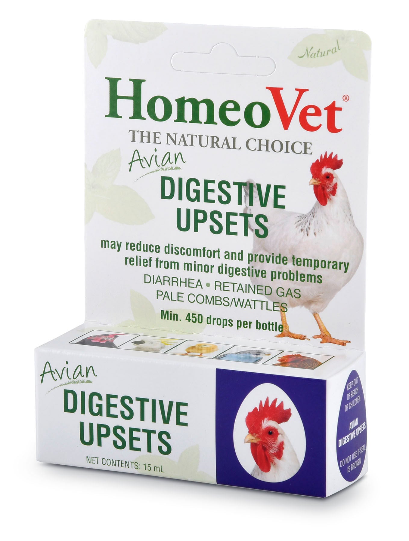HomeoVet Avian Digestive Upsets Safe, Gentle, All Natural medicines for your feathered friend. All natural Avian Digestive Upsets may reduce discomfort and provide temporary relief from minor digestive problems such as diarrhea, pale combs, and/or wattles, and retained gas. Can help provide relief from squirts associated with poor quality feed or water, change in temperature, or general stress. Safe for chicks, pullets, and layers. Minimum 450 drops per bottle. Features & Benefits: no harsh chemicals no known side effects safe for chicks, pullets, & layers great value - up to 90 doses per bottle easy liquid dosing medicine Common Symptoms: diarrhea pale combs/wattles retained gas - HEIGHT(INCHES): 4.680 - WIDTH(INCHES):1.250 - LENGTH(INCHES):3.250